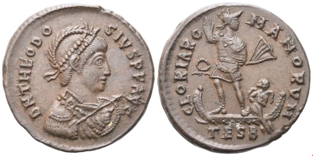 D N THEODOSIVS P F AVG Pearl-diademed, helmeted, draped, and cuirassed bust r., holding spear and round shield; Rv. GLORIA ROMANORVM Theodosius standing facing, head r. on ship, raising r. hand; Victory at helm; wreath in l. field; •TESB in exergue. RIC IX 44b.2. Extremely fine.
