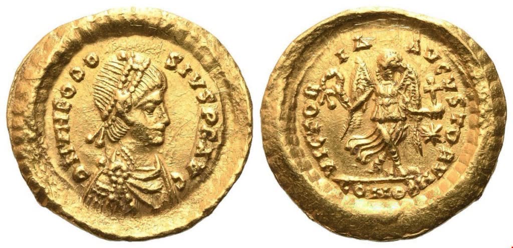 D N THEODO - SIVS P F AVG Diademed, draped and cuirassed bust r.; Rv. VICTORI - A - AVGVSTORVM Victory advancing r., head l., holding wreath and cross on globe; in r. field; CONOB in exergue. RIC X 213. Extremely fine.