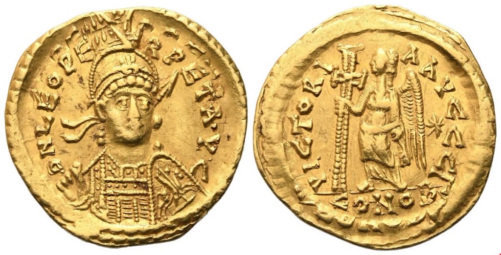 D N LEO PE - RPET AVG Pearl-diademed, helmeted, and cuirassed bust of Leo facing three-quarters r., holding with right hand a spear over shoulder and with l. hand a shield decorated with horseman motif; Rv. VICTORI-A AVGGGΓ, Victory standing l., holding long jeweled cross in r. hand, star in r. field; CONOB in exergue. RIC X 605. Depeyrot 93/1. About extremely fine / good very fine.