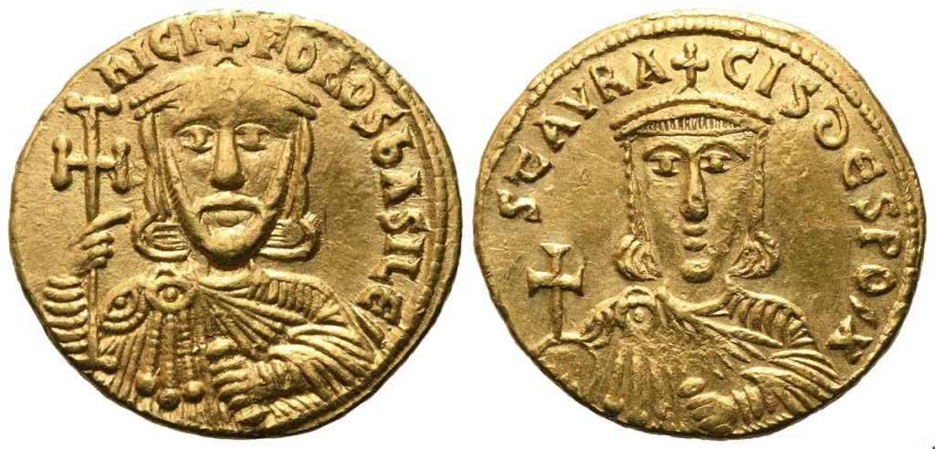 nICI - FOROS bASIL E' Bust of Nicephorus facing, with short beard, wearing crown and chlamys, and holding cross potent and akakia; Rv./ SƮAVRACIS ∂ЄSPO' X, crowned facing bust of Stauracius, wearing chlamys, holding globe cruciger and akakia. DO 2b.2; SB 1604. About extremely fine.