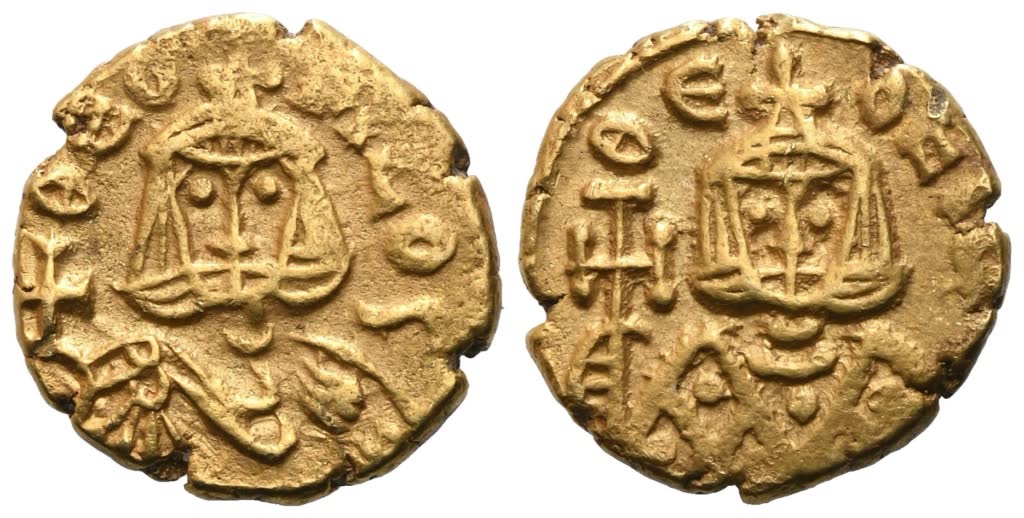 ΘЄO - FILOS Facing bust of Theophilus, crown surmounted by cross, wearing loros, holding cross potent; Rv. ΘЄOFILOS, Facing bust of Theophilus, with crown surmounted by cross, wearing chlamys, holding globus cruciger in his r. hand. DOC 24; SB 1670. About extremely fine.
