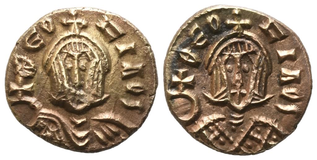 ΘЄO - FILOS Facing bust of Theophilus, wearing crown surmounted by cross and loros, holding globe cruciger; Rv. ΘЄO - FILOS, Facing bust of Theophilus, with crown surmounted by cross, wearing chlamys, holding globus cruciger in his r. hand. DOC 26b; SB 1673. Extremely fine.