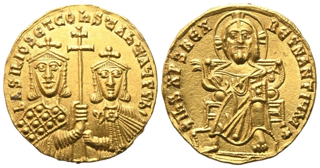+IHS XPS REX – REGNANTIYM* Christ enthroned facing, with crossed nimbus, raising r. hand in blessing and holding Book of Gospels in l. hand; Rv. BASILIOS ET CONSTANT AYGG B Facing busts of Basil, on l., and Constantine, on r., both crowned and wearing loros and chlamys respectively and holding between them a patriarchal cross. DO 2a. SB 1704. Good extremely fine.