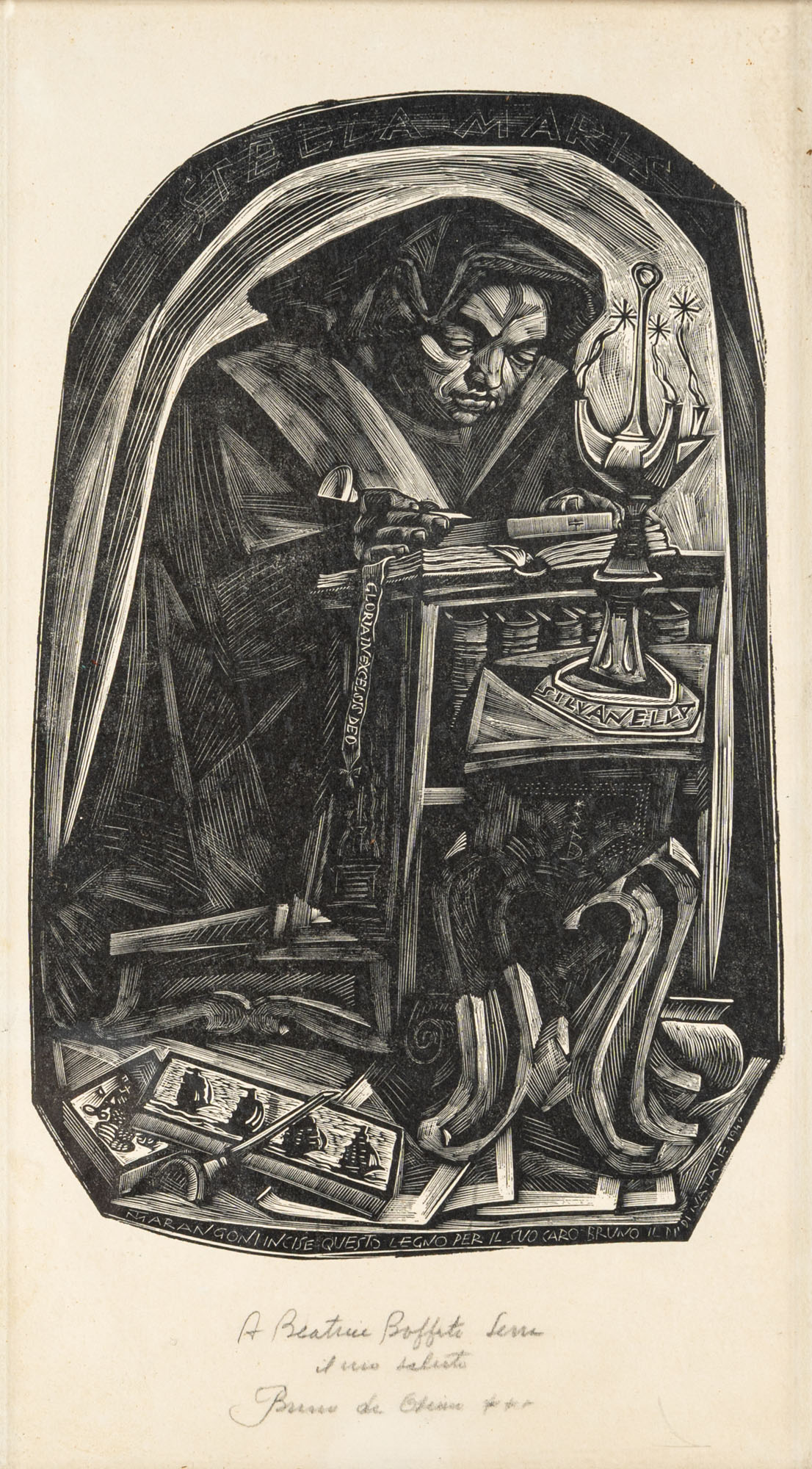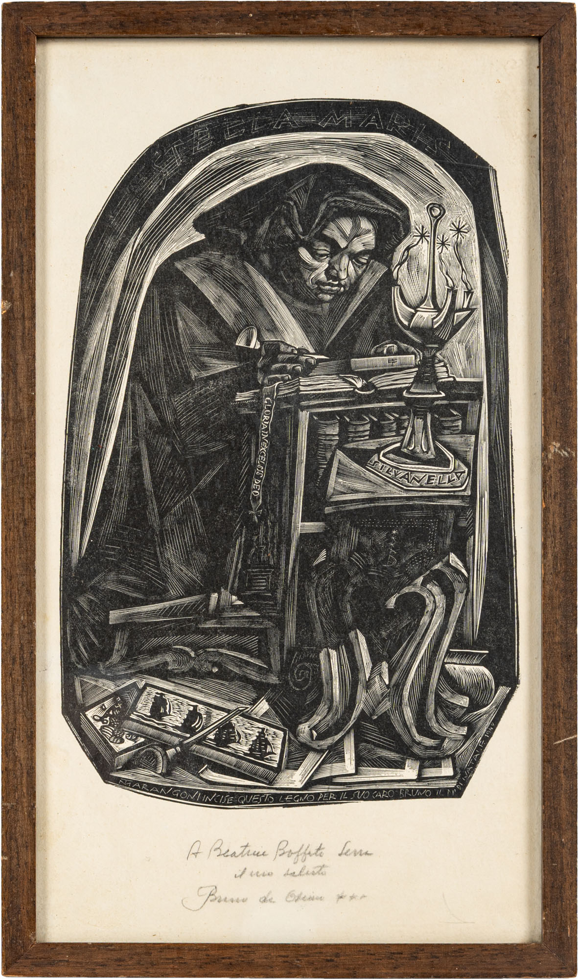 Xilografia di Bruno da Osimo con sua dedica autografa1948Incisore: Tranquillo MarangoniCornice in legno e vetro di protezione18,5 x 33,5 cm. ca.Bruno da Osimo, nome d'arte di Bruno Marsili (Osimo, 1888 - Ancona, 1962), è stato un incisore e scrittore italiano. È stato un artista dalla vastissima produzione xilografica, contraddistinta da un intimo lirismo profondamente religioso e a tratti misticoTranquillo Marangoni (Pozzuolo del Friuli, 1º aprile 1912 - Ronco Scrivia, 26 marzo 1992) è stato un incisore italiano. È stato il principale xilografo italiano del NovecentoCondizioni generali molto buone