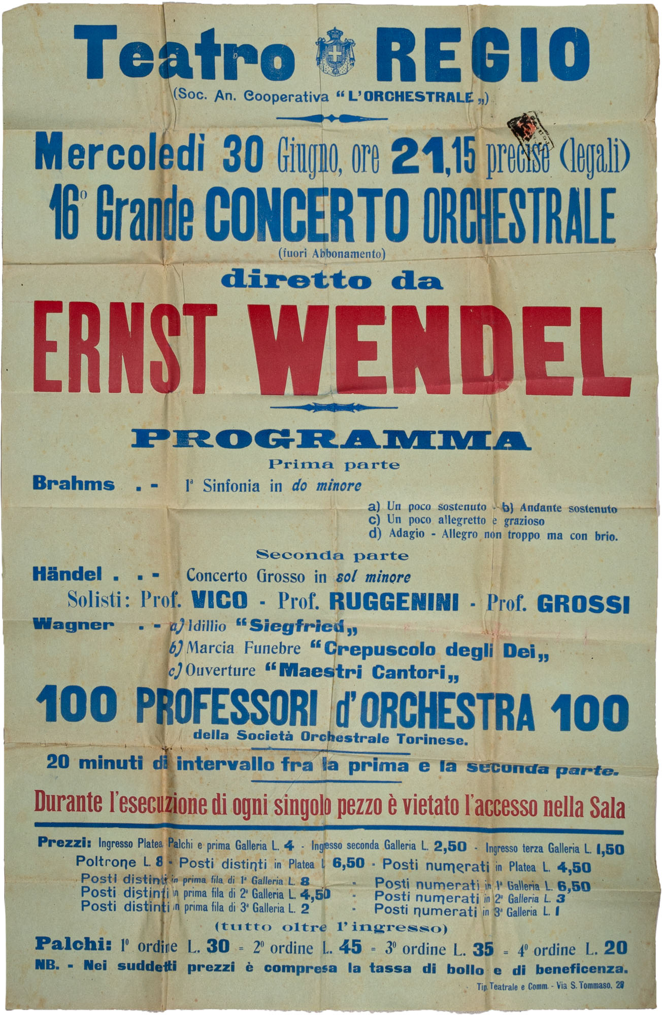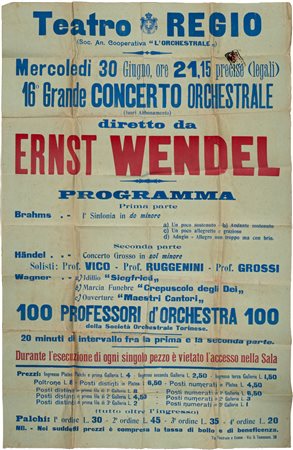 Manifesto del Teatro regio di Torino del concerto eseguito da 100 orchestrali della Società Orchestrale Torinese e dai solisti professori Vico, Ruggenini e GrossiAnni'20Cm.75 x 62Musiche di Brahmnas, Handel e WagnerCondizioni buone