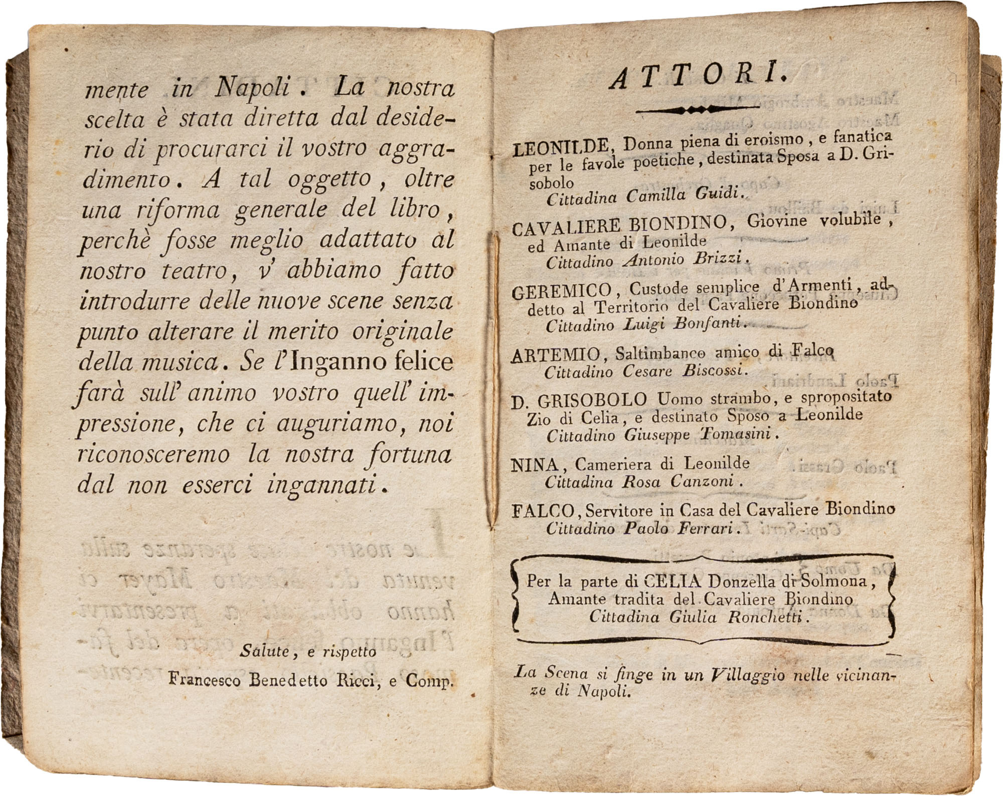 L'INGANNO FELICE, DRAMMA GIOCOSO PER MUSICA DA RAPPRESENTARSI NEL TEATRO ALLA SCALA L'AUTUNNO DELL'ANNO 1800 V.S. CORRENDO L'ANNO IX REPUBBLICANOMilano, TIPOGRAFIA PIROLA, 1800 (ca.).Legatura in cartonato rustico, pp. 40, con alcune illustrazioni in incisione. Libretto d'opera d'inizio ottocento, riporta anche i nomi degli attori, oltre che a quelli di musicisti e tecniciIn-16 gr. (mm. 170 x 100)Legatura sciolta, peraltro testo in buono stato di conservazione