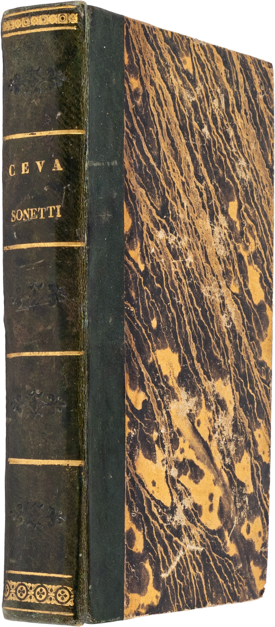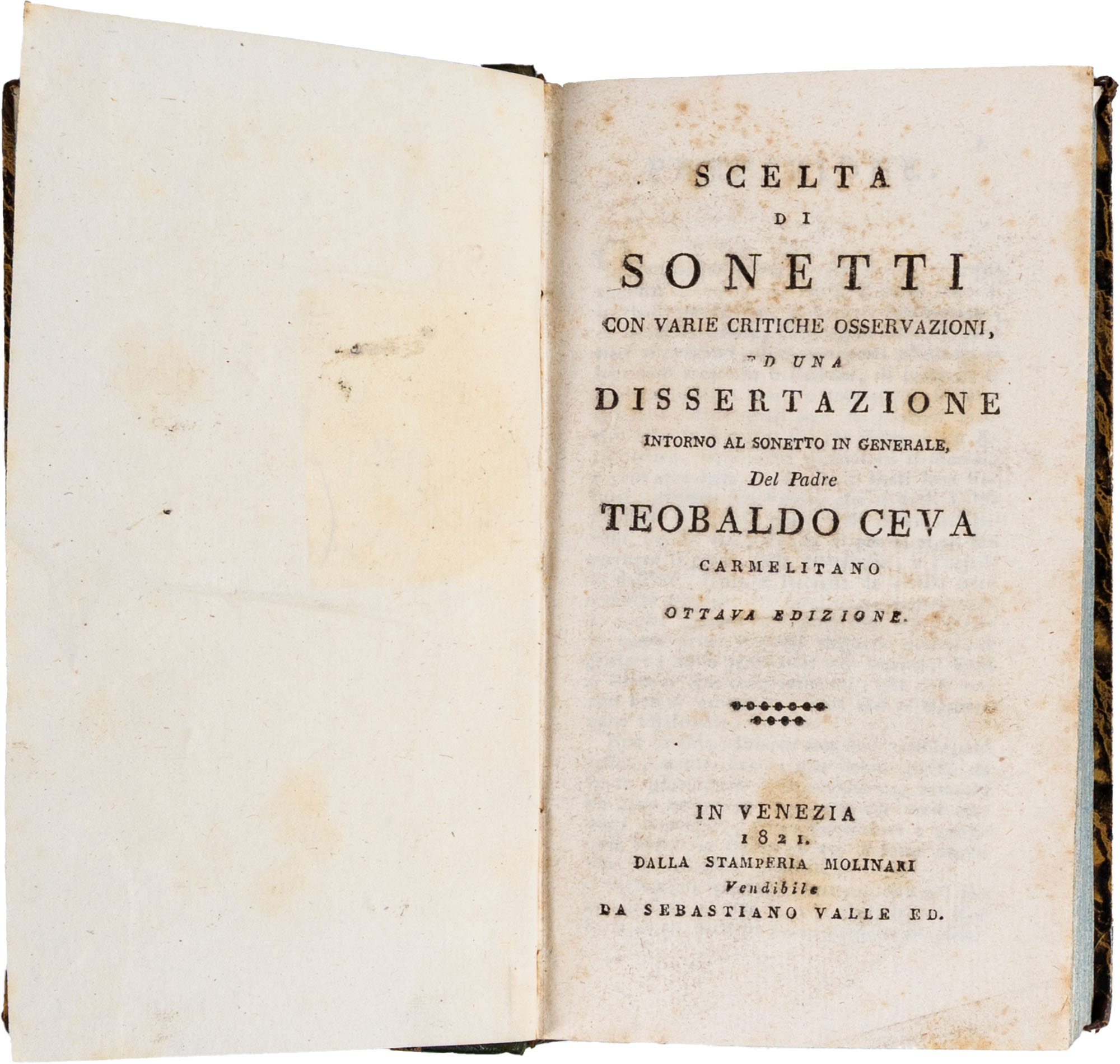 CEVA TEOBALDO - SCELTA DI SONETTI CON VARIE CRITICHE OSSERVAZIONI, ED UNA DISSERTAZIONE INTORNO AL SONETTO IN GENERALEVenezia, STAMPERIA MOLINARI, 1821Legatura in mezza pelle coeva, titolo oro al dorso, tagli a spruzzo azzurri, pp. 394In-16 gr. (mm. 161 x 91)Esemplare leggermente fiorito, peraltro in buono stato di conservazione