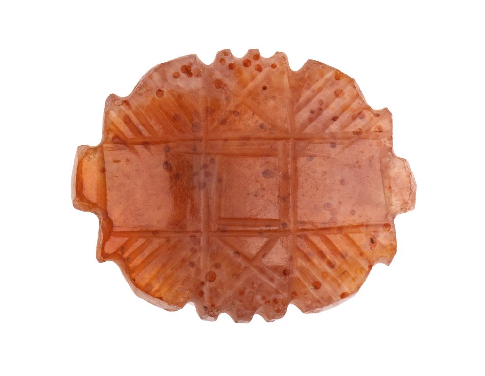 A Western Asia carnelian stylized amulet. Pierced lenghtwise both sides and engraved with stylized geometrical pattern. Wear marks. Ca. 2nd Millennium B.C. 32 x 40 x 8 mm