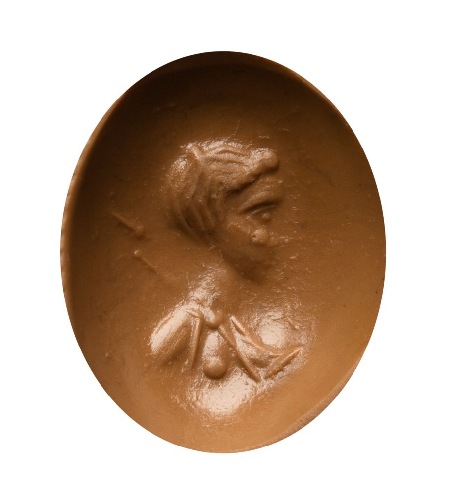 Lotto 11 | A Roman cabochon carnelian intaglio. Female bust.