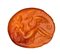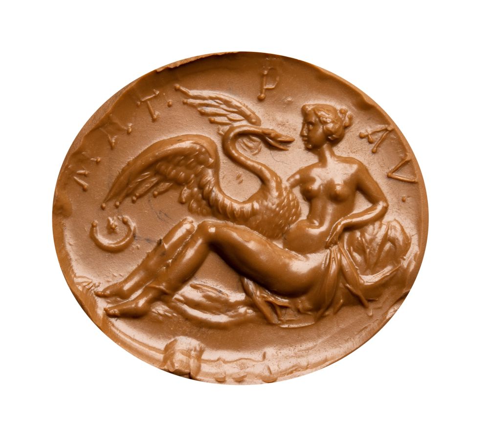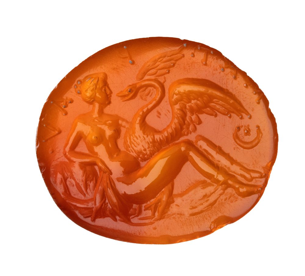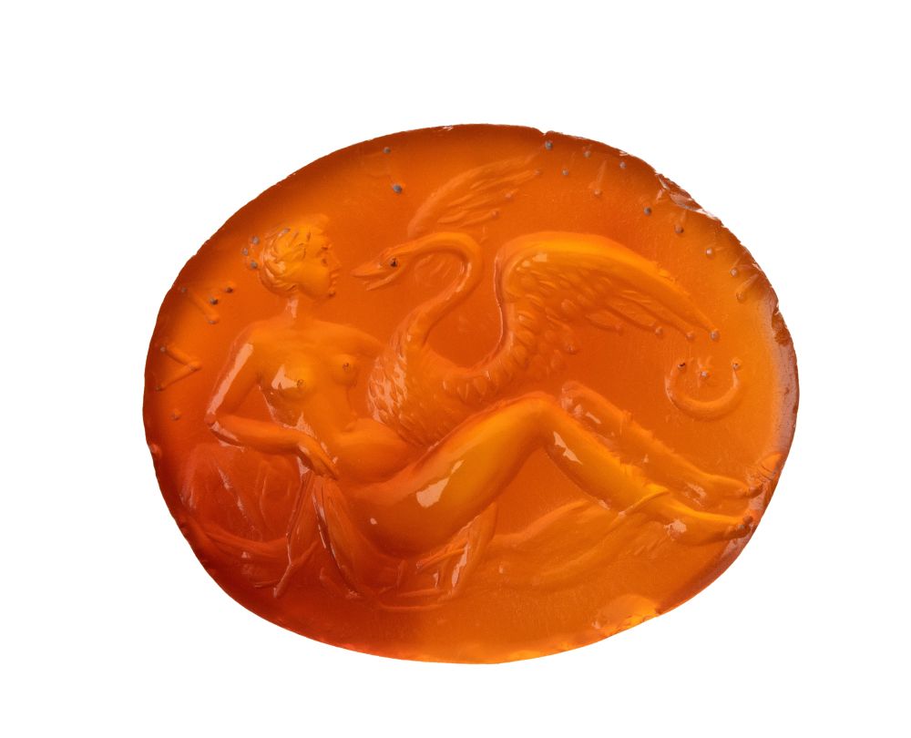 A large Roman carnelian intaglio. Leda with the swan Beautiful depiction of Leda with the swan, inspired by Ovid's Metamorphoses. The figure is naked, sitting on the ground, on a drapery, half-reclining and with her elbow resting on a rock covered by the same cloth that she holds in her right hand. The swan approaches, spreading its wings, as a sign of amorous desire. The two figures look at each other. In the background, the letters MAT-PAV, possibly the name of the ancient owner; a crescent moon with a star give this gem a magical-erotic power. Small missing or chipped edges. Wear marks. Fine execution, with traces of small globular elements. Deep red color. Large stone.