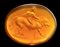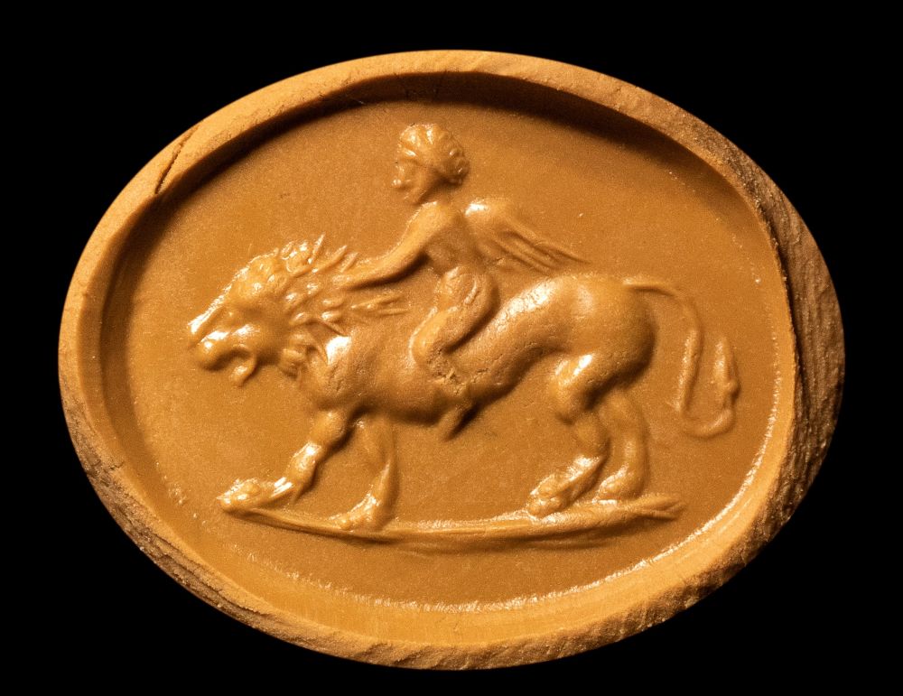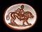 A Roman carnelian intaglio. Eros on a lion. The mighty feline walks to the right, carrying a winged erote on its back. The erote grabs the lion's mane to hold on. Groundline. Allegory of AMOR OMNIA VINCIT. Slight wear marks. 1st - 2nd century A.D. 12 x 15 x 3 mm.