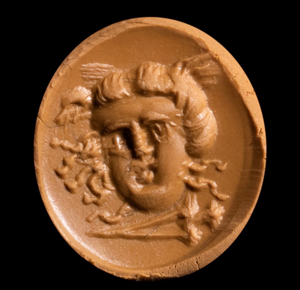 A roman lapis lazuli magical intaglio. Gorgona mask with torch