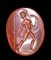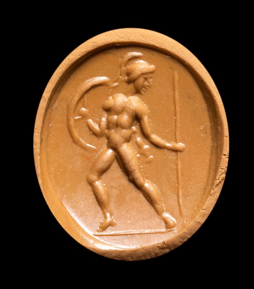 A Roman carnelian intaglio. Warrior. The soldier advances to the right, with the frontal torso and the head turned back in profile. The figure is naked and protected by a shield and helmet. With his right hand he holds the spear; the sword is hung with a belt. Groundline. Typical pose inspir 1st - 2nd century A.D. 9x12x3 mm