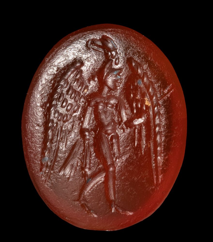 A Roman carnelian intaglio. Ganymede with the eagle. The young Ganymede is kidnapped by Zeus who turned into an eagle. The majestic bird of prey spreads its wings to ascend to Olympus, carrying the beautiful Ganymede who wears the phrygian cap. Slight wear marks. 2nd century A.D. 9 x 12 x 4 mm