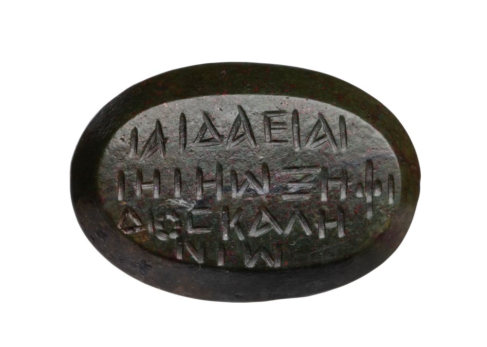 A Roman magical double sided bloodstone intaglio. A vase into an ouroboros with inscriptions. In the center, a crater, surrounded by an ouroboros, symbol of perpetual time. On the reverse, magical inscriptions. 2nd-3rd century A.D. 10 x 14 x 3 mm