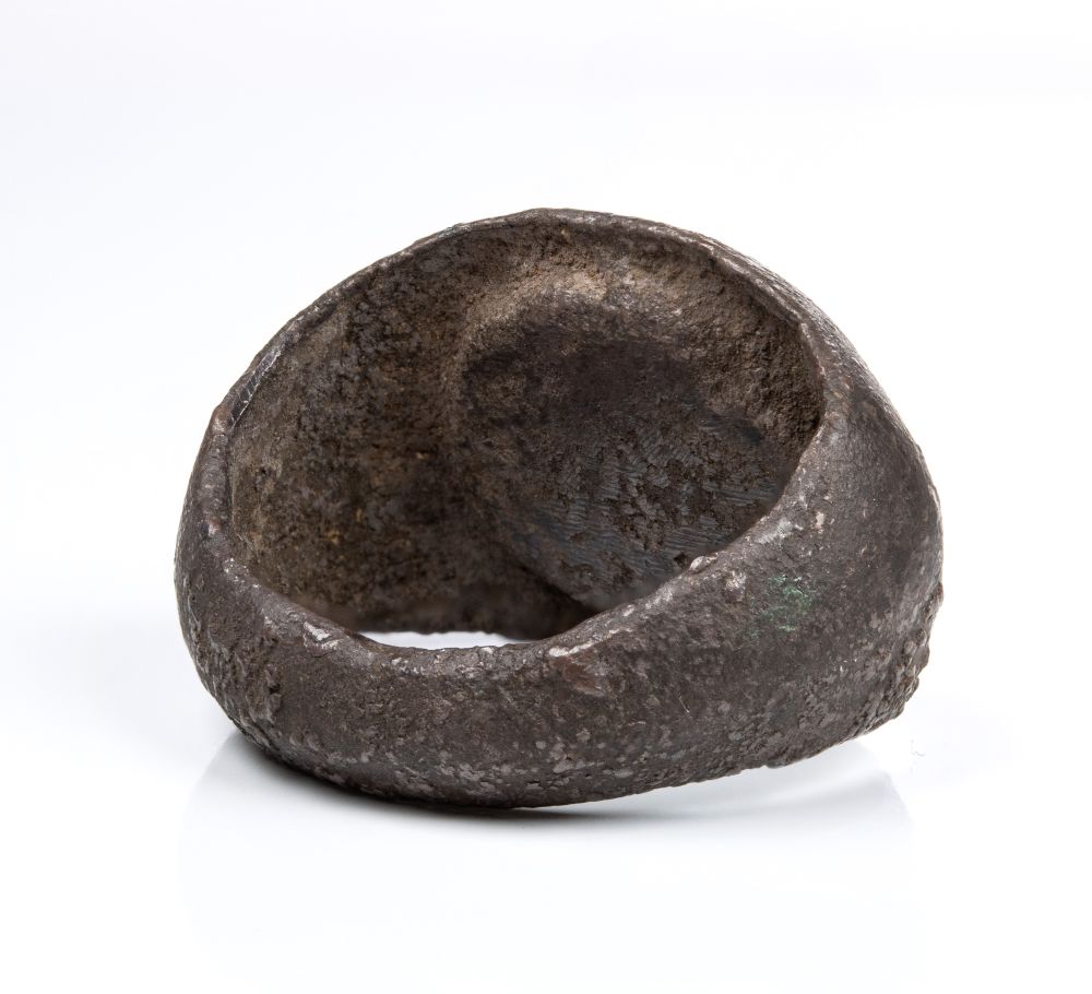 A Roman carnelian intaglio set in a silver ring. Three pigs. Bucolic scene with three pigs mating near a bush. Groundline. The metal is crystallized. Wear marks. This scene can be considered an erotic scene between animals, much loved by the Romans. 1st-2nd century A.D. Stone: 12 x 13 mm; 9.45 gr. US 14 3/4.