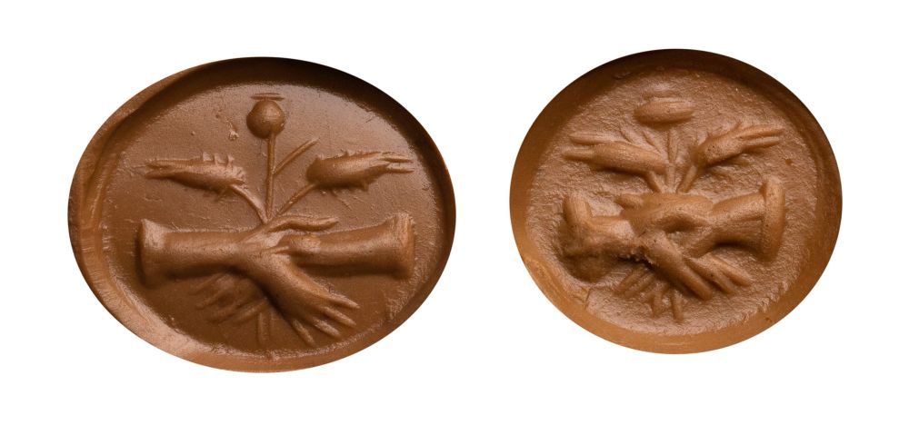 A lot of 2 Roman hardstone intaglios. Dextrarum Junctio. One in carnelian and the other one in agate, both shows a dextrarum junctio, symbol of marriage or alliance. Wear marks. 1st-2nd century A.D. Min. 7,5 x 9 x 2 mm; Max. 8 x 9 x 2 mm