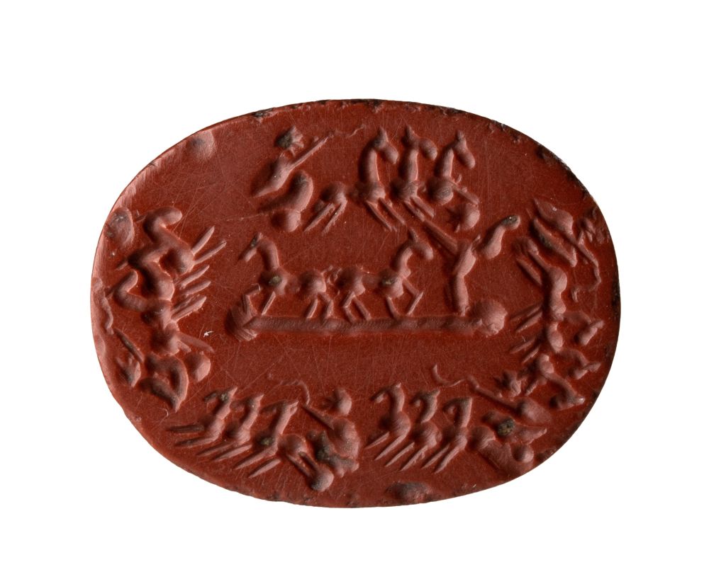 A large Roman provoncial red jasper intaglio. Circus horse riding scene.