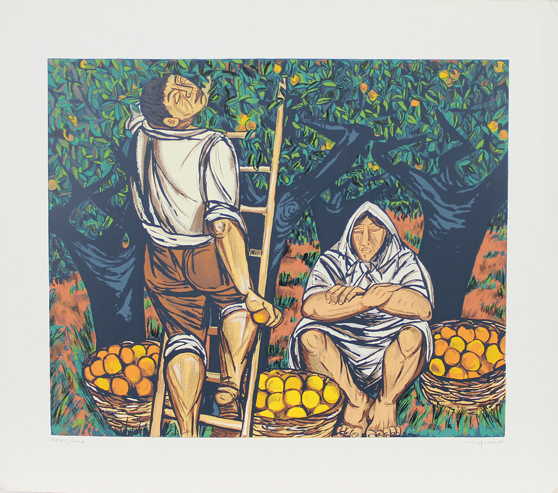 Migneco Giuseppe Raccoglitori litografia su carta Fabriano, cm. 60x69,5, es. XXVIII/XXX firmata in basso a destra, timbro a secco in basso a sinistra senza cornice