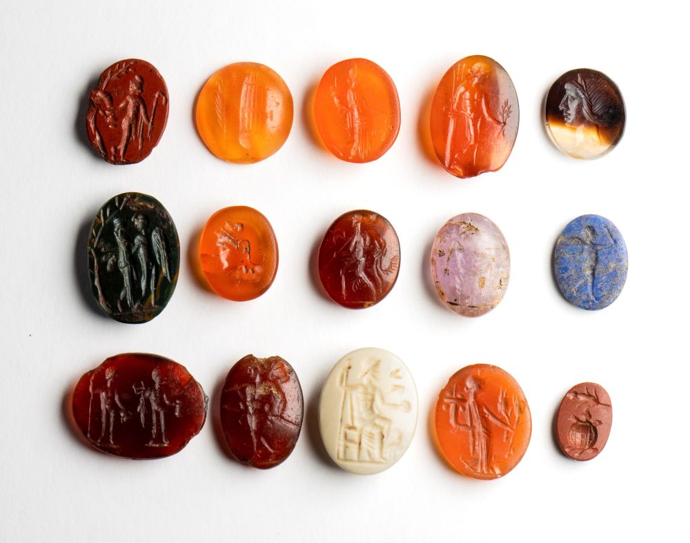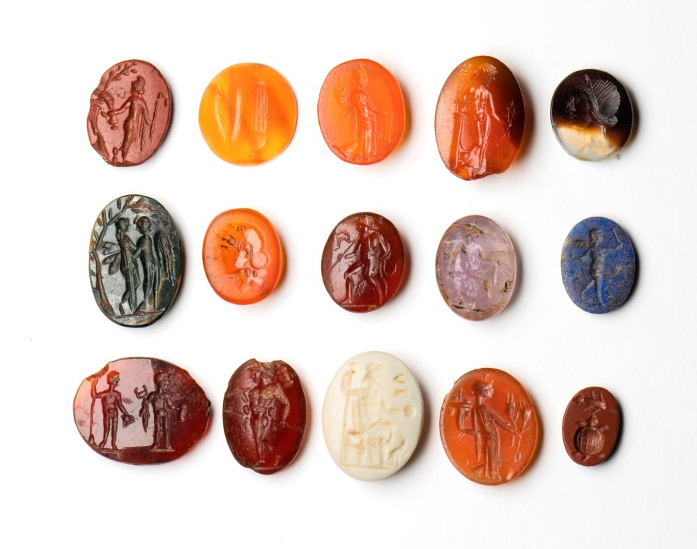 A lot of 15 hardstone intaglios. Various subjects. An interesting group of various intaglios in red jasper, carnelian, agate, amethyst, lapis lazuli and variegated green jasper with deities, mythological scenes, heads, allegorical attributes and animals. Some chipping and missing edges. Light signs of wear. 1st-2nd century A.D. circa Min. 6,5 x 9 x 1,5 mm; Max. 13 x 16 x 3 mm