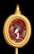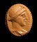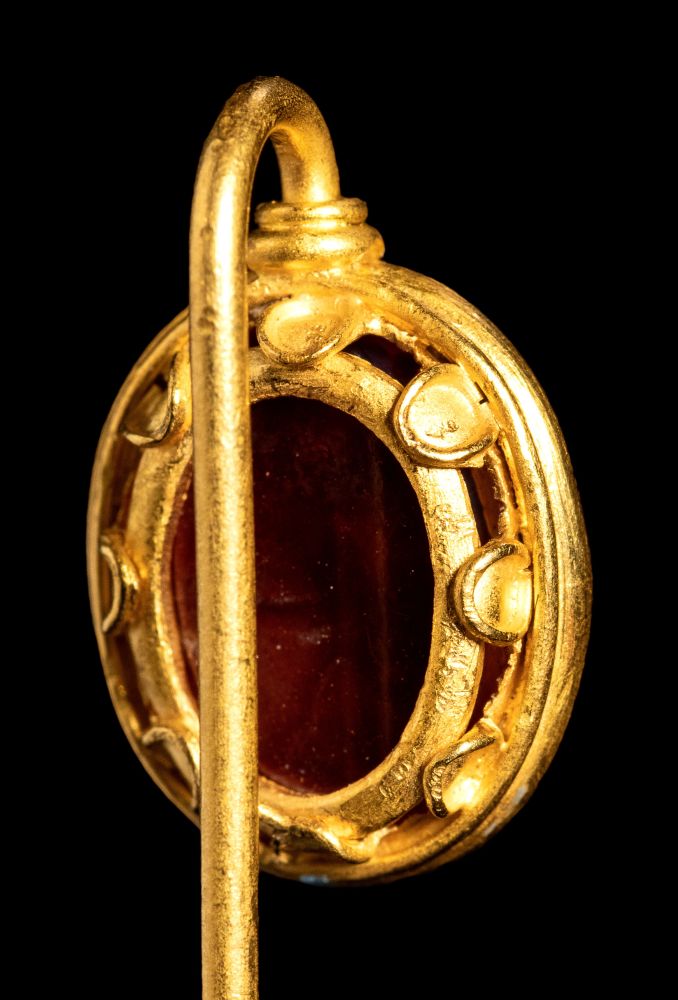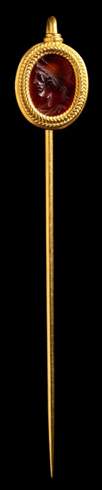 A Roman carnelian intaglio set in a gold stick pin. Apollo. The intaglio shows the portrait of a male character turned left. The youthful features and the hair ornament suggest it may be a representation of the god Apollo. Slight wear marks on the surface of the stone. The gold stick pin is composed of a large ov 2nd century A.D. intaglio 6x9 mm; overall 10x15 mm; length 70 mm; 3,58 gr.
