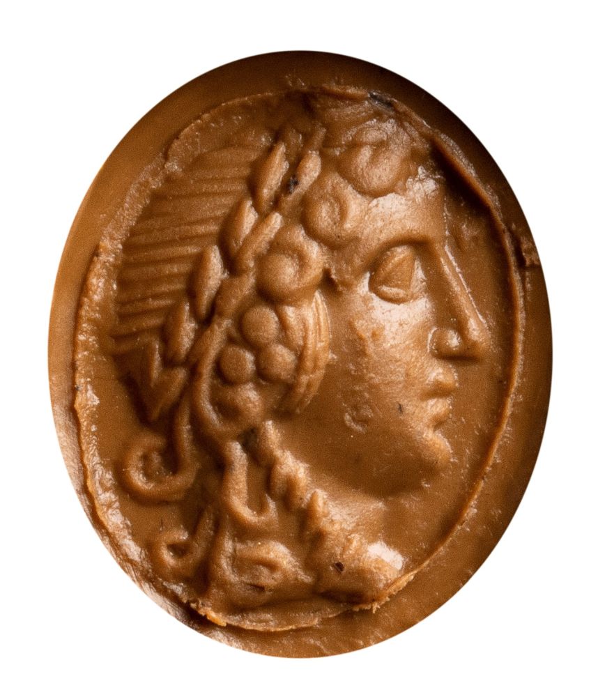 A Roman gold ring set with a nicolo intaglio. Head of Dyonisus.