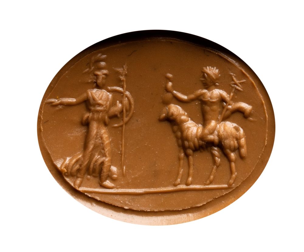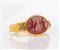A Roman gold ring set with a red jasper intaglio. Hermes and Athena.