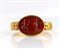 A Roman gold ring set with a red jasper intaglio. Hermes and Athena. The hoop rounded without and flatten within is adorned on the shoulders with three gold elements forming grapes. The oval box setting contains a beautiful red jasper intaglio. Hermes on the ram is holding a caduceus and his purse. In front of him, Athena standing with the weapons. Groundline. Wear marks. 2nd - 3rd century A.D. Stone 10 x 14 mm; gr 7; US 9,5