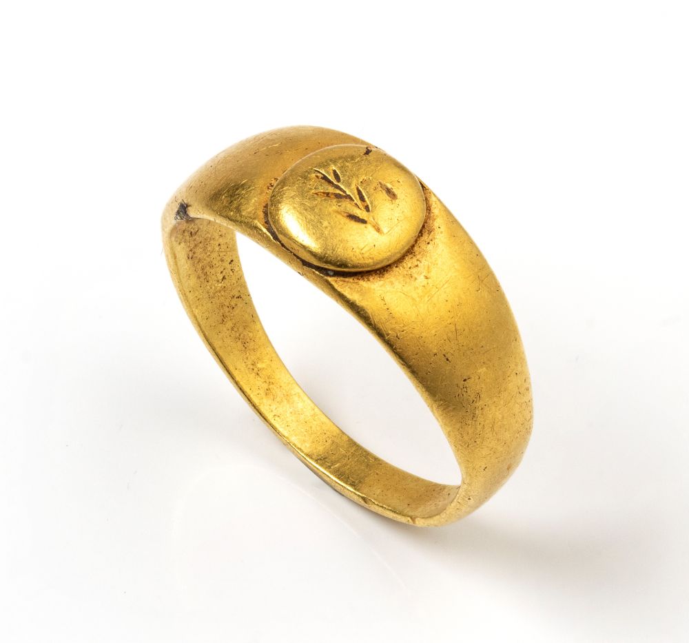 A Roman engraved gold finger ring with a palm branch Round bezel added above the ring, with a small engraved palmette. Wear marks. 1st - 2nd century A.D. 3 gr. US 3 3/4