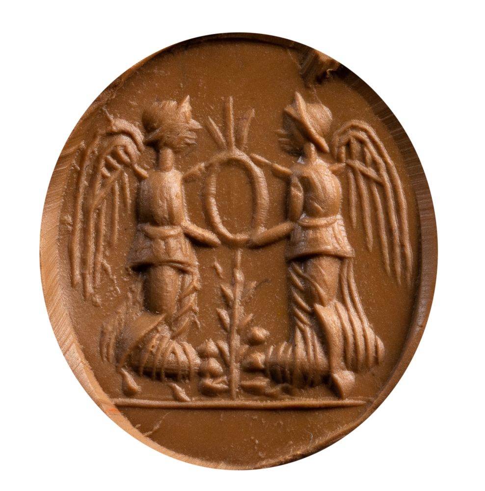A large Late Roman red jasper intaglio. Emblematic scene with two victories. Central symmetrical scene with two winged victories holding up a crown together, a shrub at the bottom. The model derives from the coin reverses of some 3rd century roman issues (for ex. Gordian III, Pisidia, Antioch). Very small chip on the edge. 3rd-4th century A.D. 15 x 18 x 4 mm
