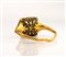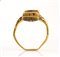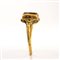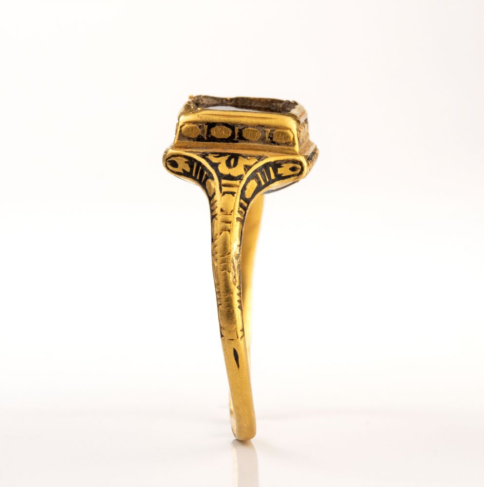 A Late Renaissanace gold and black enamel ring set with a garnet. With a thin rounded ciseled enamel hoop, broadering to the shoulders and surmounted by a sqaured high box setting with ciseled enameled decoration. The bezel contains an ungraved tablet cut hessonite garnet. Metal distortions, enamel missing and wear marks. Possibly Eastern Europe. Late 16th - Early 17th century Stone 6 x 7 mm; gr 4,28; US 6,5
