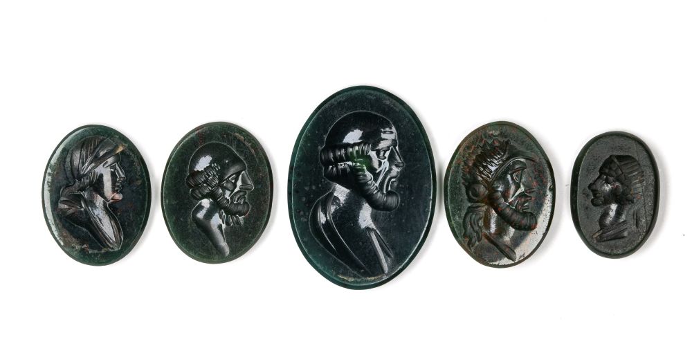 Lot of 5 heliotrope intaglios. Various subjects Noblewoman bust;draped philosopher bust; king bust; head of bearded man wearing a shell hat; philosopher bust. 19th century min 13x9x2,5 - max 21x16x2 mm
