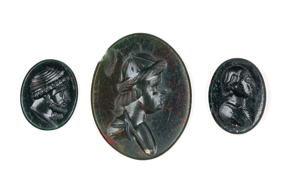 Lot of 3 heliotrope intaglios. Various subjects Nobleman bust; bust of a male character wearing a decorated headgear; bust of bearded man with headgear. 18th century min 14x11x1,8 - max 25x20x2 mm