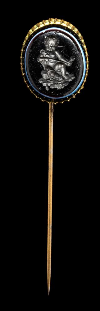 A dark glass paste impression set in a gold stick pin. Hercules as a child killing the snakes The scene refers to a famous episode from the childhood of Hercules, who strangles the snakes. The infant is sitting on the rocks, killing a snake that clings to his arm, while another lies dead below. Three-layered glass, black and blue, imitating the ni 19th century. Glass 18 x 21 mm; H. 80 mm; 7 gr.