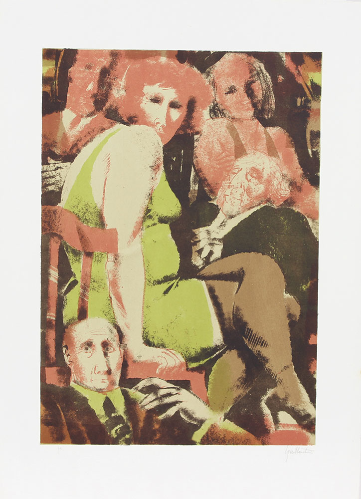 Squillantini Remo Cafè Chantant litografia su carta, cm. 69x50,5, es. prova d'autore firmata in basso a destra, timbro a secco in basso a sinistra, timbro in filigrana in basso a destra, etichetta per certificazione di garanzia della Prospettive d'Arte di Milano al retro senza cornice