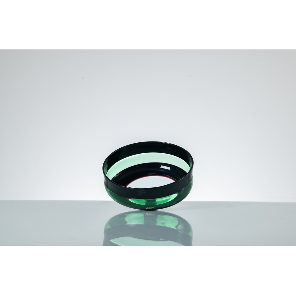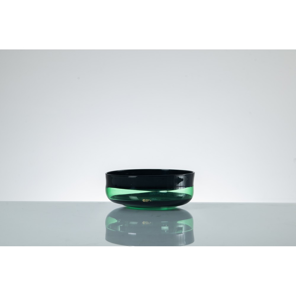 Ciotola in vetro trasparente verde con decoro di fascia incamiciata verde scuro, corpo circolare con bocca piana. Etichetta di produzione. Firma a graffio.