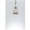 Lampada a sospensione a cinque luci, struttura in metallo, corpo composto da costole sagomate in vetro incolore e pagliesco pizzicate alle estremità, diffusori a campana costolate in vetro incolore, minuterie in metallo dorato.
