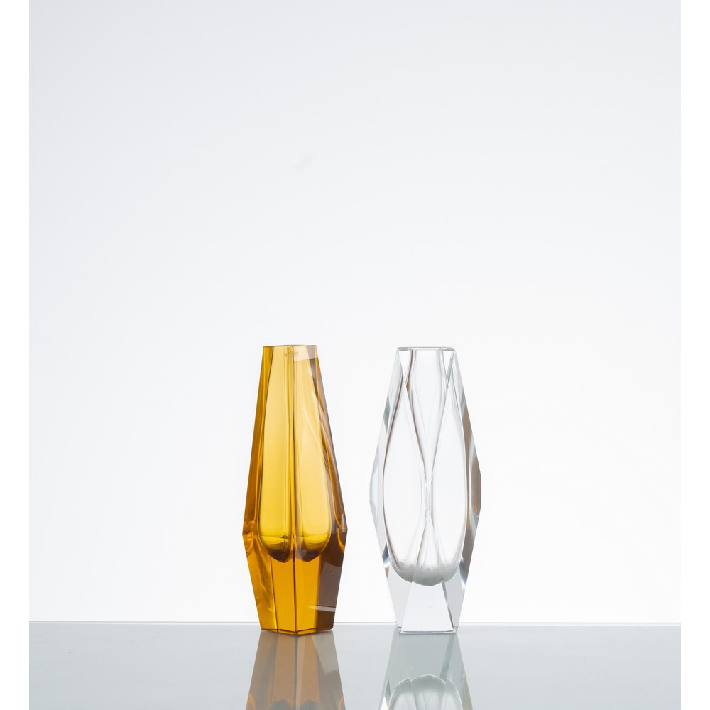 Due vasi in vetro uno pagliesco e uno incolore, corpo sfaccettato con base e bocca quadrate.