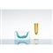Un vaso in vetro sommerso incolore e giallo con corpo a parallelepipedo, base e bocca quadrata. Un posacenere in vetro sommerso azzurrino, corpo rettangolare con bocca piana.