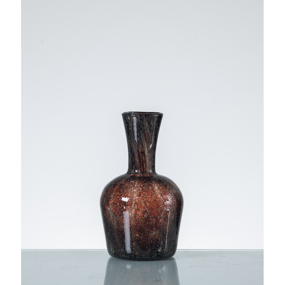 Vaso della serie “Efeso” in vetro caramello, corpo a bottiglia sferica nella parte inferiore, bocca piana circolare. Etichetta di produzione con numerazione 25545.