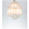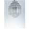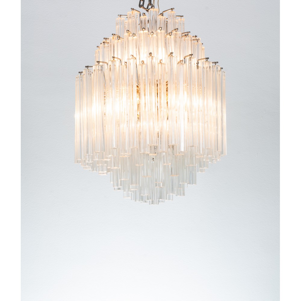 Lampada a sospensione a sedici luci, struttura in metallo cromato, diffusore composto da elementi modulari della serie “Quadrilobi” in cristallo incolore. Un elemento mancante e 3 elementi con difetti.