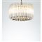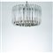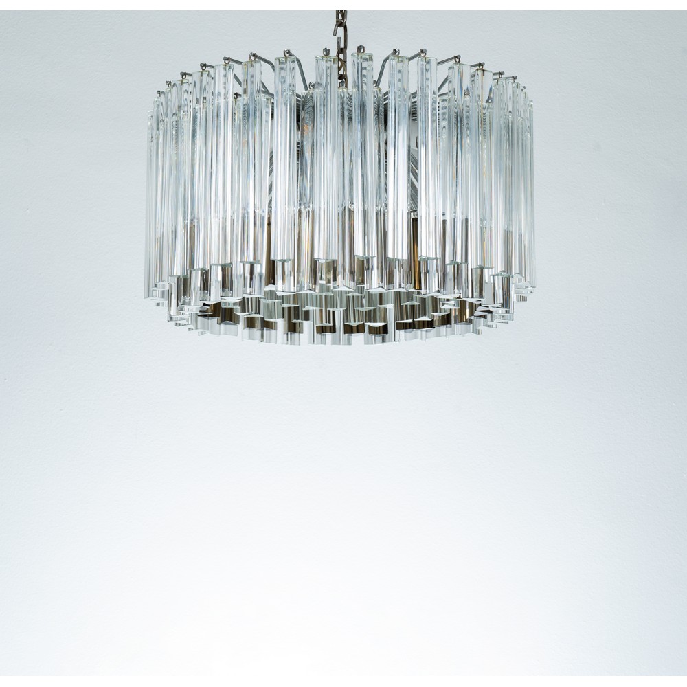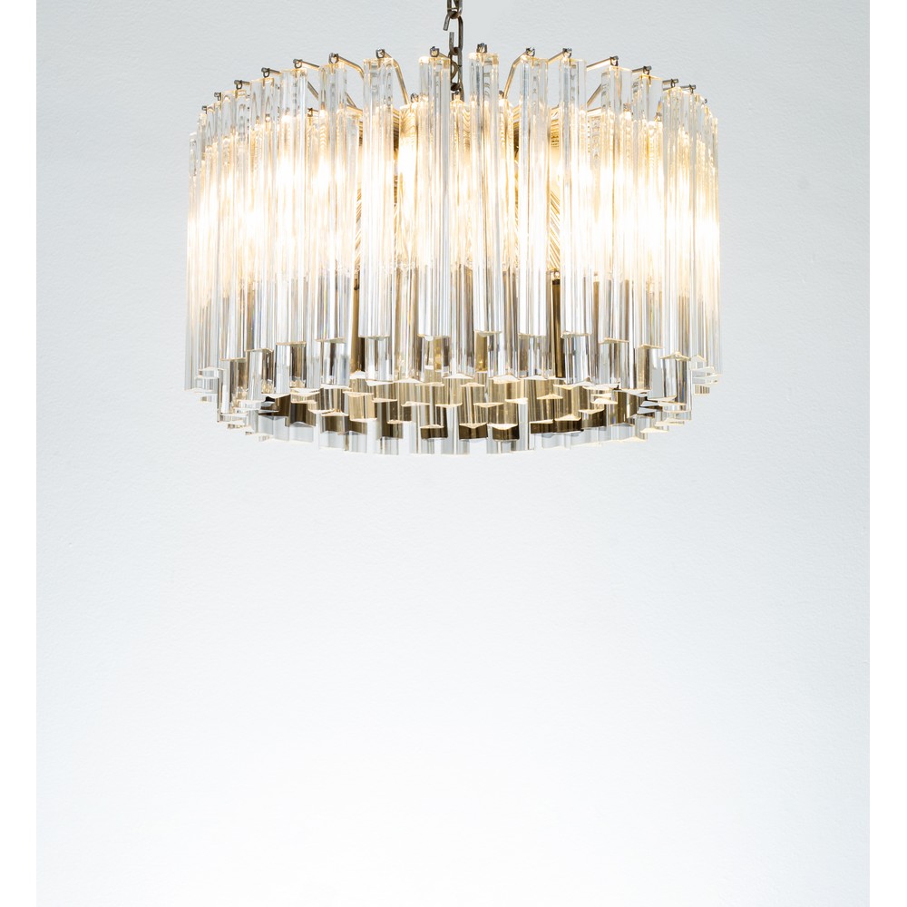 Lampada a sospensione a sei luci della serie ”Trilobo” a canne piene, struttura in metallo cromato, diffusore circolare composto da elementi prismatici in vetro pagliesco e trasparente.