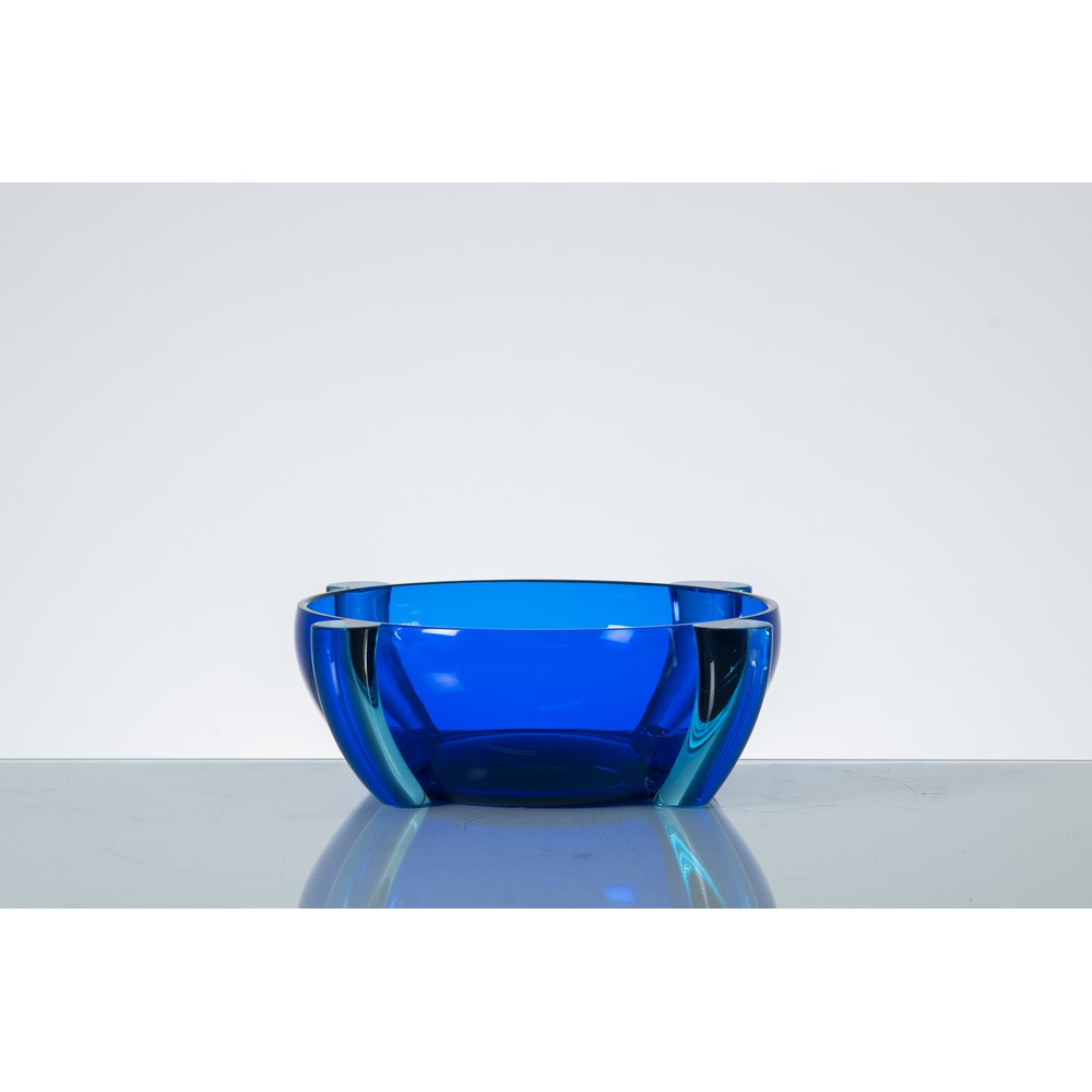 Coppa in vetro soffiato blu con anse in cristallo, corpo semisferico con bocca piana circolare. Firma a punta Venini Italia 1997, Tina Aufiero.