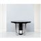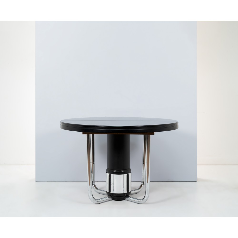 Tavolo da pranzo in legno esotico con struttura in tubolare di metallo cromato, piano circolare con piede centrale cilindrico, piano apribile con allungo interno.