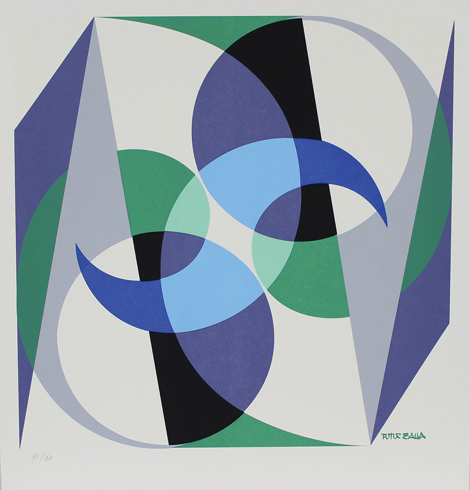 Balla Giacomo Equilibrio spaziale serigrafia su carta Fabriano, cm. 74x70, es. 91/150 timbri a secco Balla Futurista in basso a sinistra e Serigrafia dall'Originale Futurballa in basso a destra, firmata Futurballa in lastra, dichiarazione di garanzia di Luce Balla senza cornice