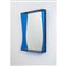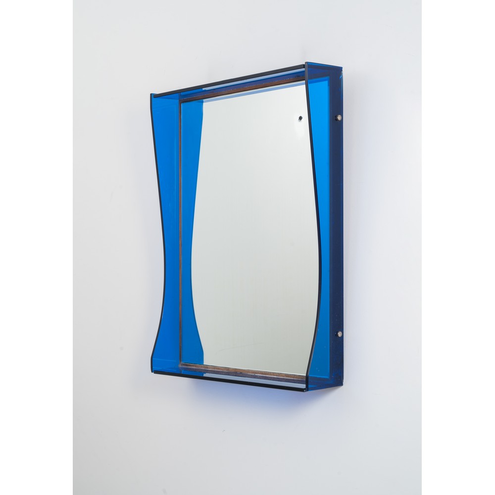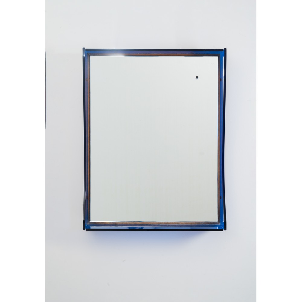 Specchio da parete con struttura in metallo cromato, rivestimenti interni in cristallo colorato blu molato e specchiato. Sbeccature.