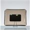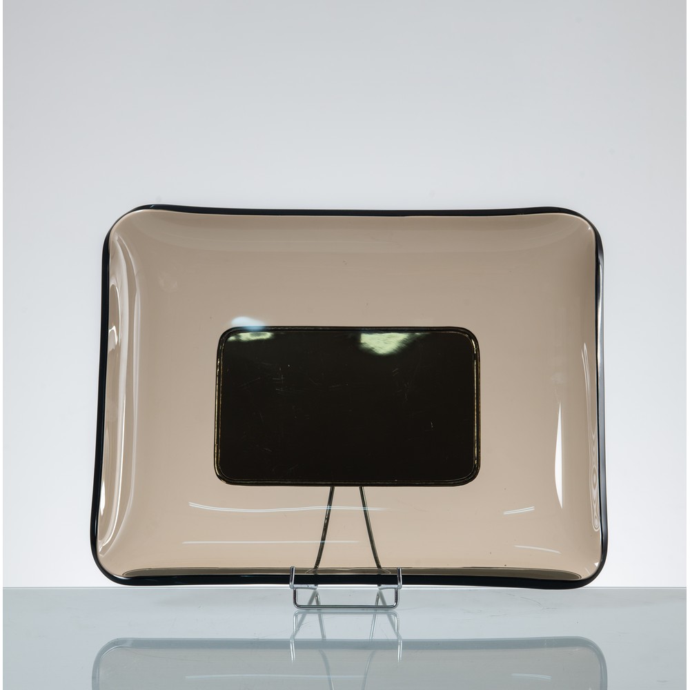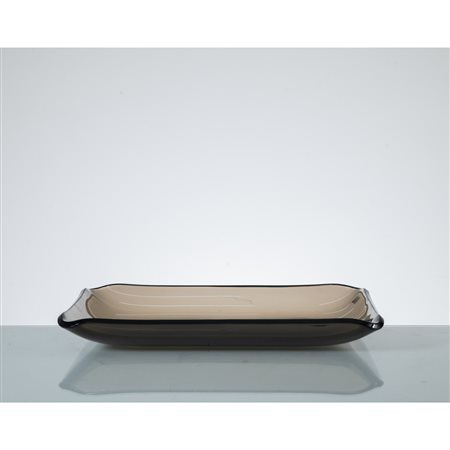 Centrotavola in cristallo fumè curvato e molato, corpo rettangolare, ottone.