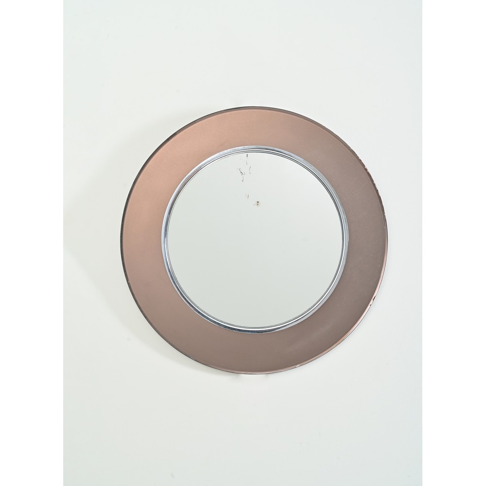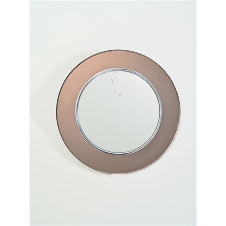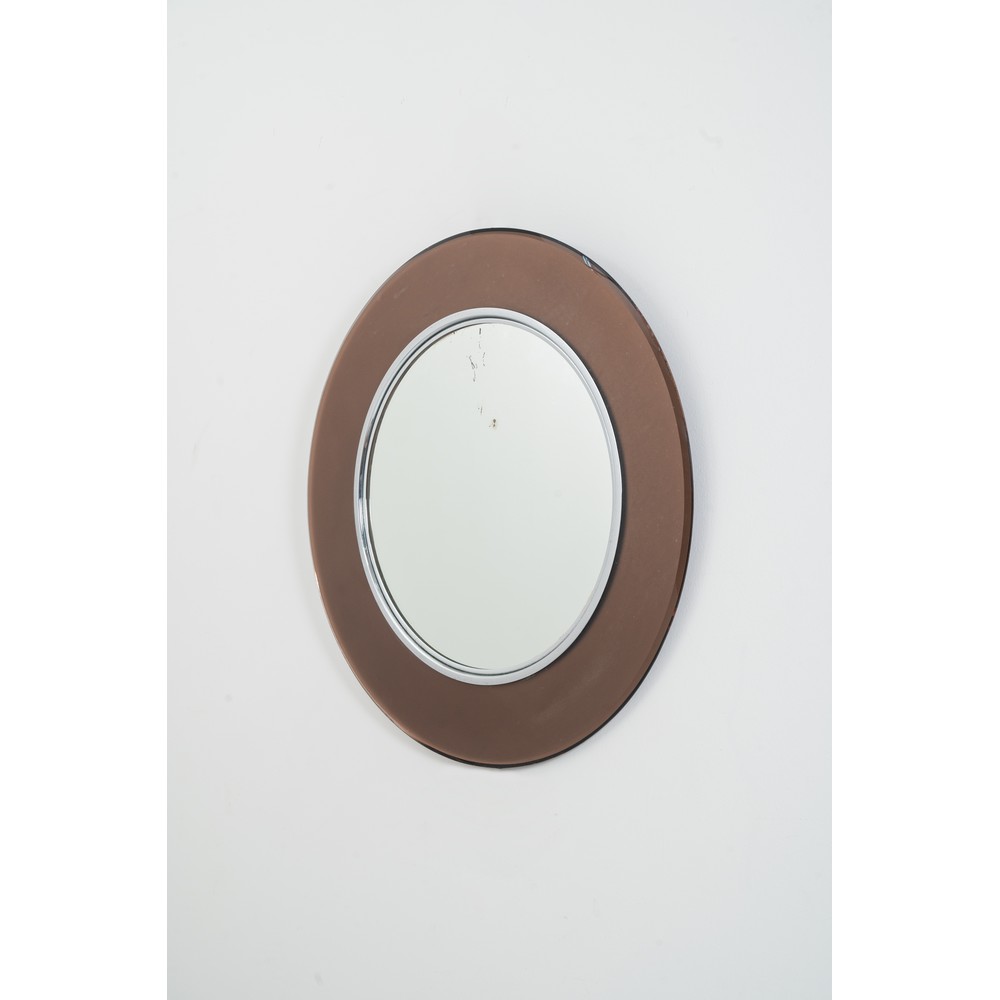 Specchio da parete circolare con cornice in cristallo fumè satinato, bordo molato, cristallo specchiato e metallo cromato. Marchio di produzione e data Maggio 1965.