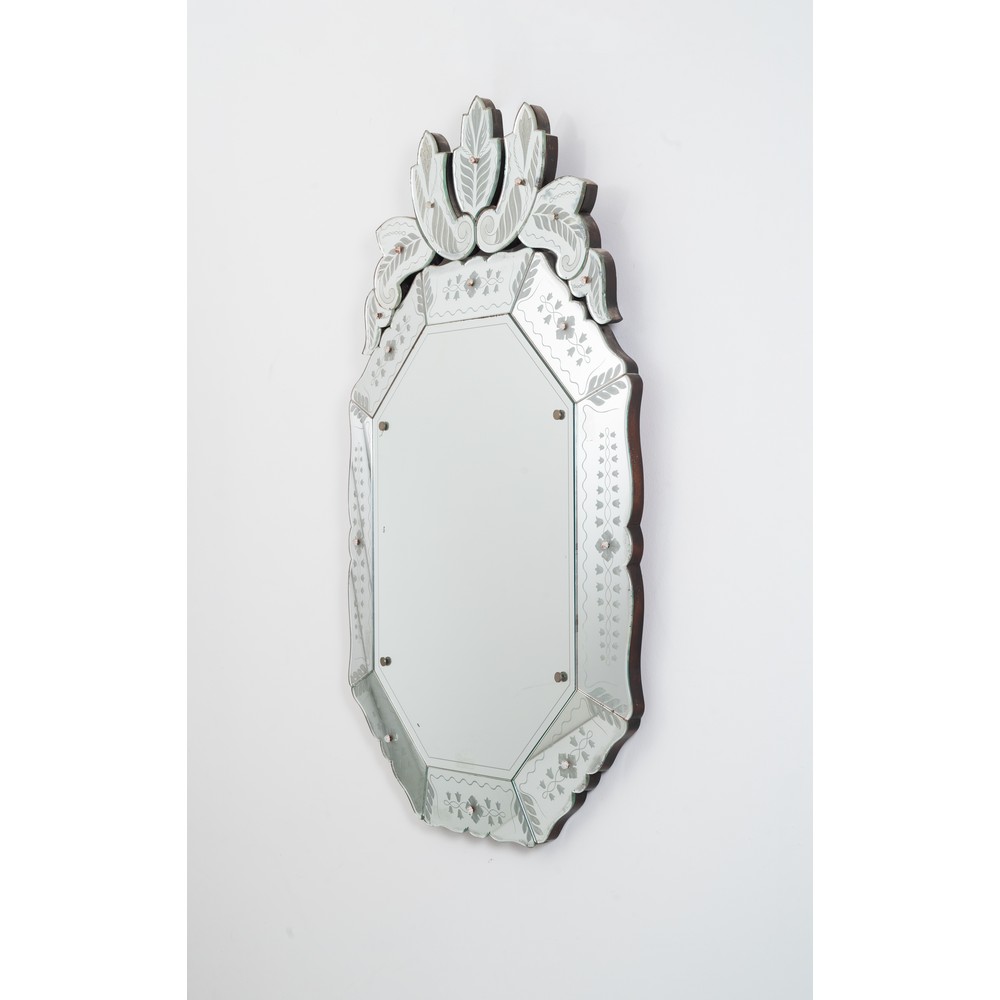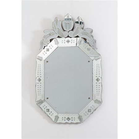 Specchio da parete sagomato con struttura in legno, cristallo specchiato, cristallo molato e decorato con incisioni floreali e fogliacee.
