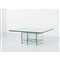 Tavolo da salotto con struttura in cristallo incolore di grosso spessore e tubolari in metallo nichelato, piano quadrato.
